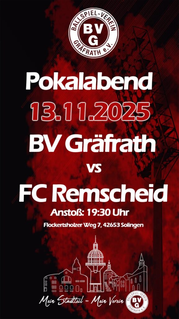 Am kommenden Donnerstag, den 13.11.2025 haben wir am Flockertsholzer Weg ein absolutes Highlight auf dem Programm. Im Pokal trifft die ERSTE auf den Traditionsverein FC Remscheid. Es ist davon auszugehen, dass der FCR einige Fans nach Gräfrath mitbringt, also sollten mindestens so viele BVG-Fans auch am Platz sein, um die ERSTE zu unterstützen. Das Spiel beginnt um 19.30 Uhr, selbstverständlich wird für das leibliche Wohl am Platz gesorgt werden, Heiß- und Kaltgetränke werden reichlich vorhanden sein um sich zwischendurch zu stärken. Wir freuen uns auf viele Besucher auf der Sportanlage, bis morgen….