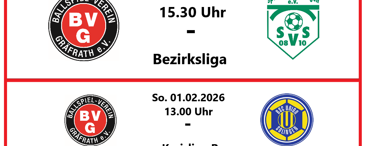 Es geht endlich wieder los, nach der Winterpause beginnt am kommenden Sonntag den 01.02.2026 die Rückrunde im Seniorenbereich. Die ERSTE trifft in der Bezirksliga mit den neuen Trainer Kaan Kursun um 15.30 Uhr im Lokalderby auf den Tabellenführer SV Solingen 08/10 aus Wald. Es gibt sicherlich einfachere Aufgaben als im ersten Spiel auf eine Spitzenmannschaft zu treffen, aber nach der Winterpause weiß niemand wo man leistungsmäßig steht, ein Überraschungserfolg ist der ERSTEN mit der neuen Führung am Spielfeldrand sicherlich zuzutrauen. Erstrecht wenn möglichst viele BVG-Fans die Mannschaft am Platz unterstützen, für das leibliche Wohl der Gäste wird wie immer gesorgt.