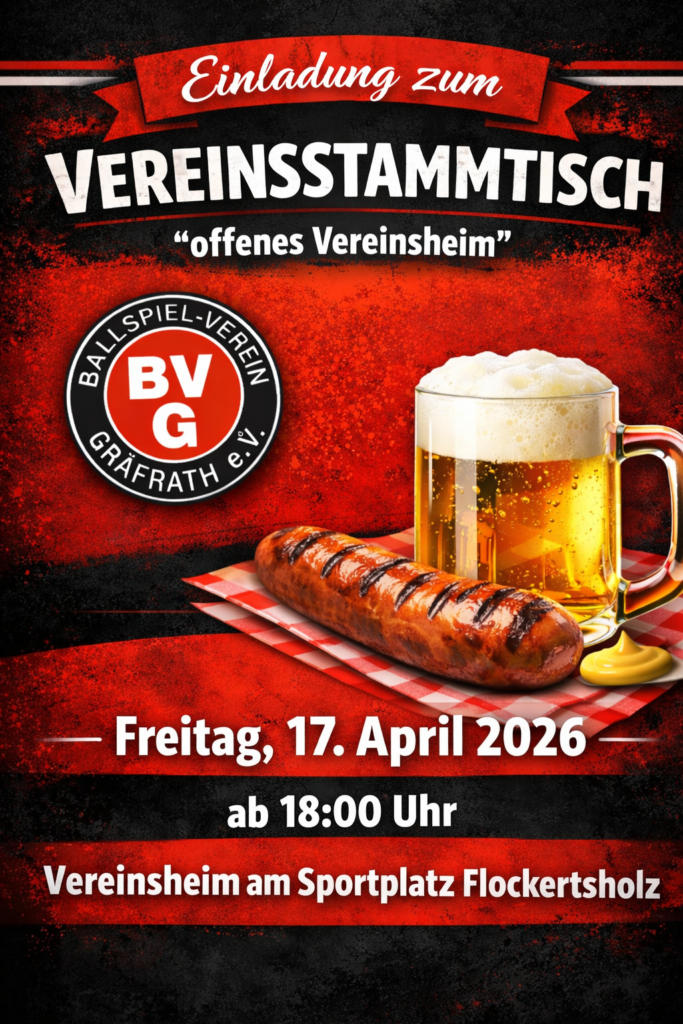Die letzten BVG-Stammtisch Abende im „offenen Vereinsheim“ wurde gut angenommen, also wollen wir nun alle aktuellen und ehemaligen BVGeler, aber auch alle anderen Gräfrather und Nicht-Gräfrather bereits zum nächsten Termin am 17.04.2026 ab 118.00 Uhr ins Vereinsheim einladen. Wir freuen uns über zahlreiches Erscheinen in netter Runde wollen wir bei einigen Kaltgetränken und kleinen Speisen quatschen und gemeinsam einen schönen Abend verbringen!